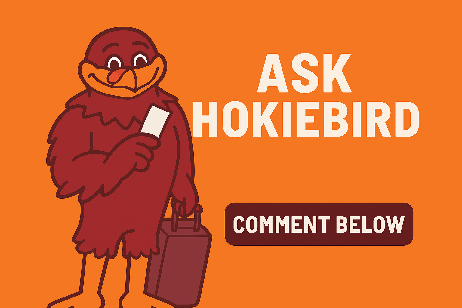 Welcome to Ask HokieBird, the maroon-and-orange advice column where tailgates meet tough love. Whether you’re dealing with relationship drama, fantasy football betrayal, or the agony of watching a noon kickoff from the West Coast—HokieBird is here with absolutely unqualified, questionably helpful, and 100% entertaining wisdom. Submit your questions, get roasted (lightly), and remember: if you can’t trust a giant anthropomorphic turkey with your life choices, who can you trust?
